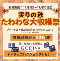 📢 実りの秋❗️たわわな大収穫祭🌰開催‼️ 期間:本日11月1日〜11月30日 迄 ブランド品・貴金属の 10,000円以上のお買い取りでお買取額最大20%UP🔥 ※インゴット、特定品は対象外 更に50組様限定で GODIVAオータムコレクションプレゼント🎁🍫 ご来店の際は、査定前にキャンペーン内容をネットで見た‼️と声掛け下さいませ🙇 (査定後のご提示は無効となりますのでご了承ください。)
