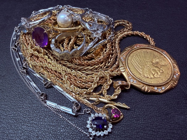 5ドル金貨ペンダントトップ付K18ネックレスをはじめたくさんのリングやネックレスなどを高価買取させて頂きました。
