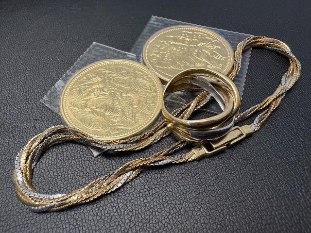 天皇陛下御在位60年記念金貨やK18/pt900ネックレス、リングを高価買取させて頂きました。